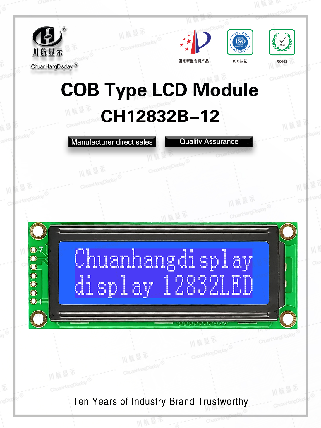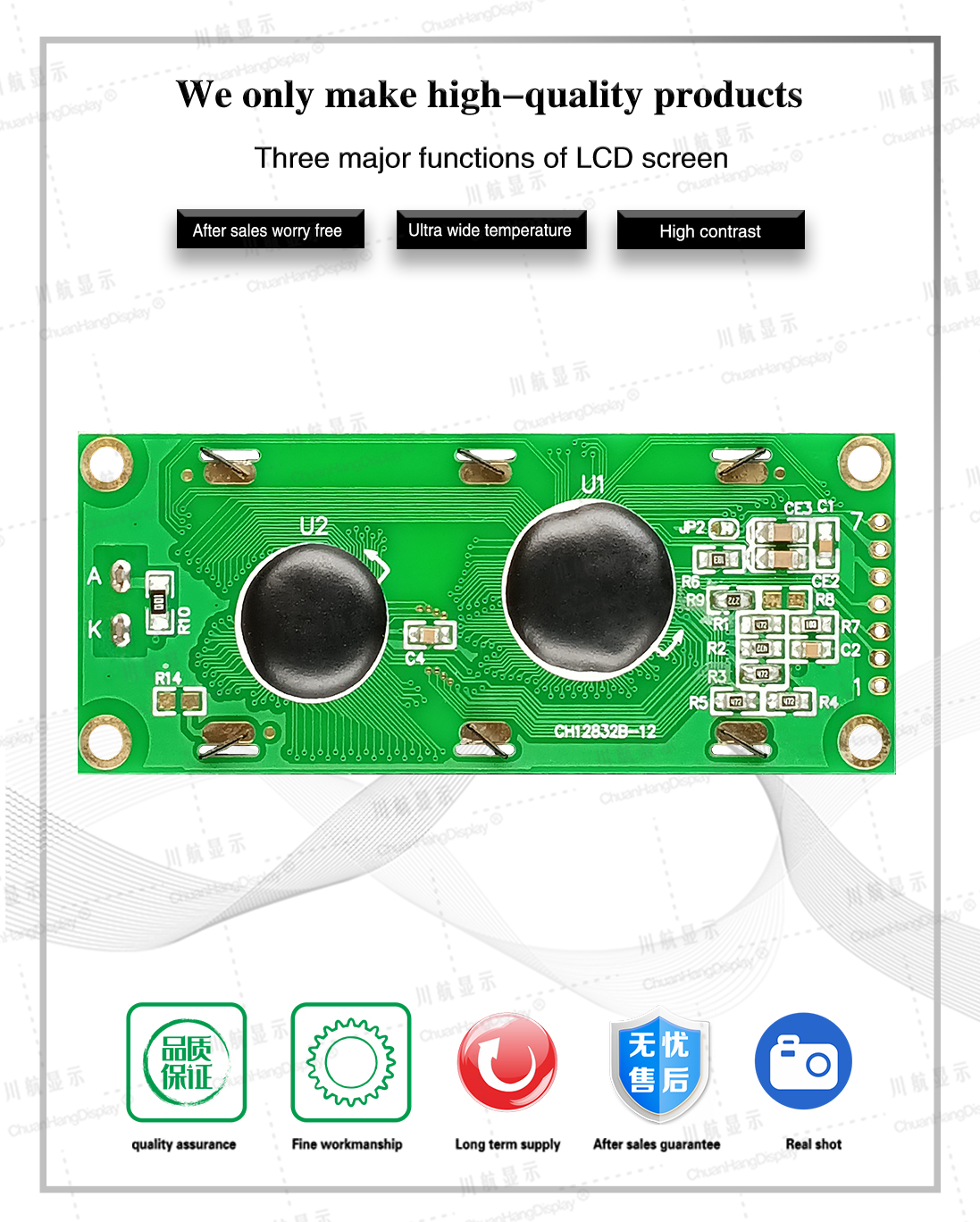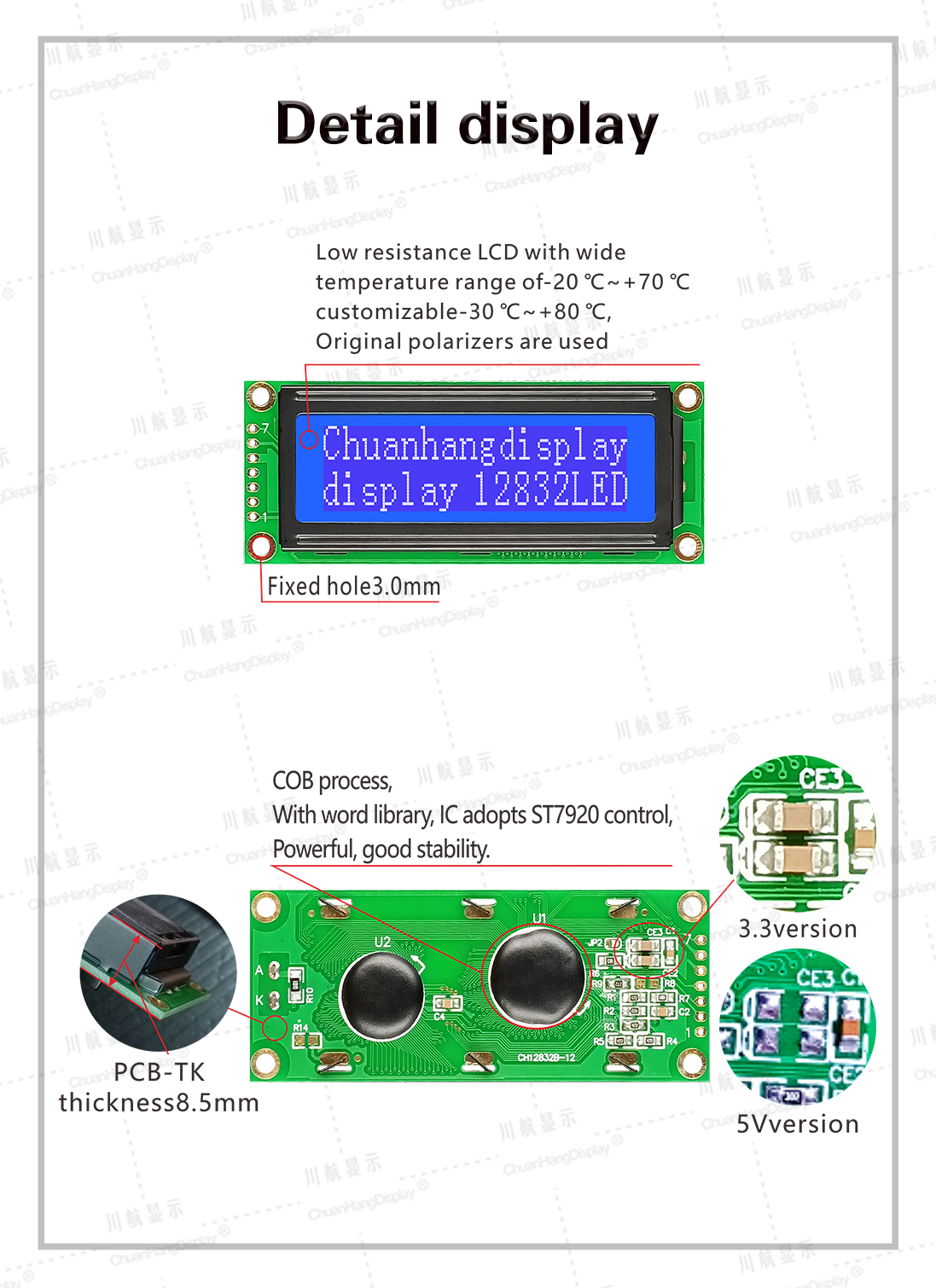 1.1 COB process, product with backlight, conductive tape connection, stable structure 1.21C uses st7920, two chips for simplified Chinese character library or traditional Chinese character library 1.3 Low power consumption, with 5V/3.3V two power modes, no backlight current within 8mA, backlight current within 40mA.