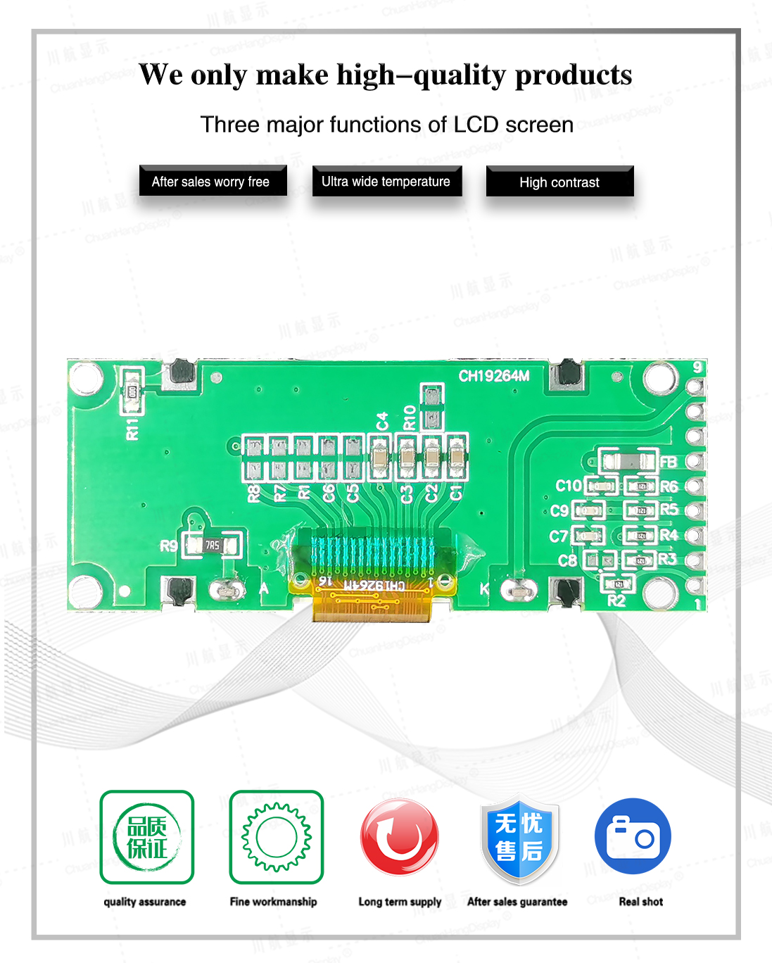 1.1 C0G process, FPC is welded on PCB, the product has backlight, thin thickness and stable structure.