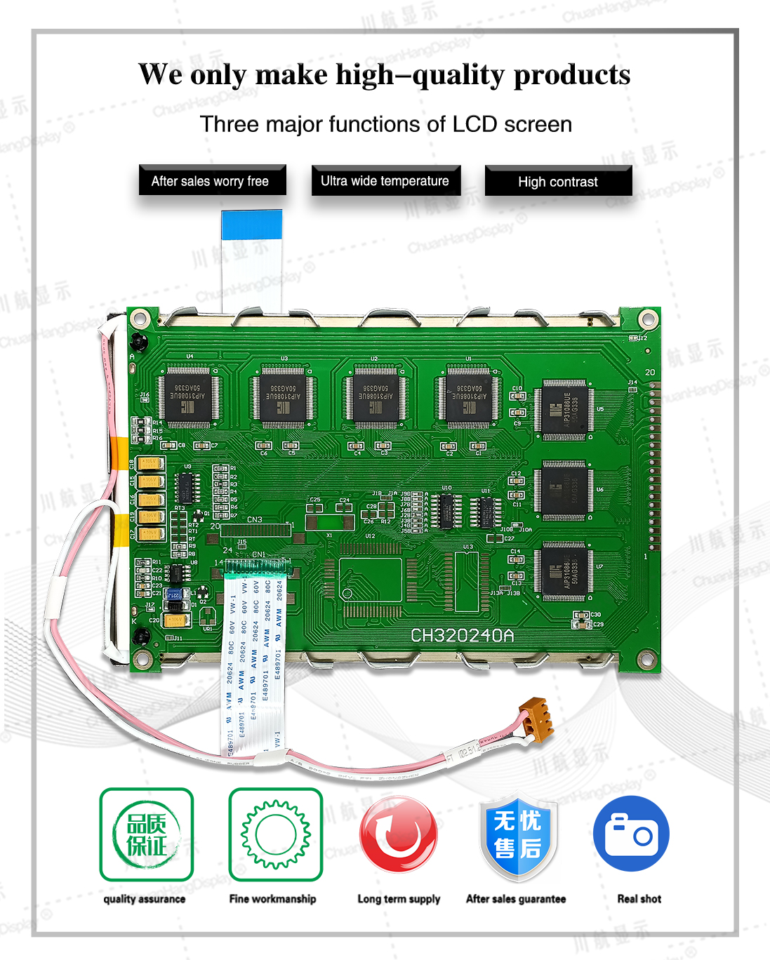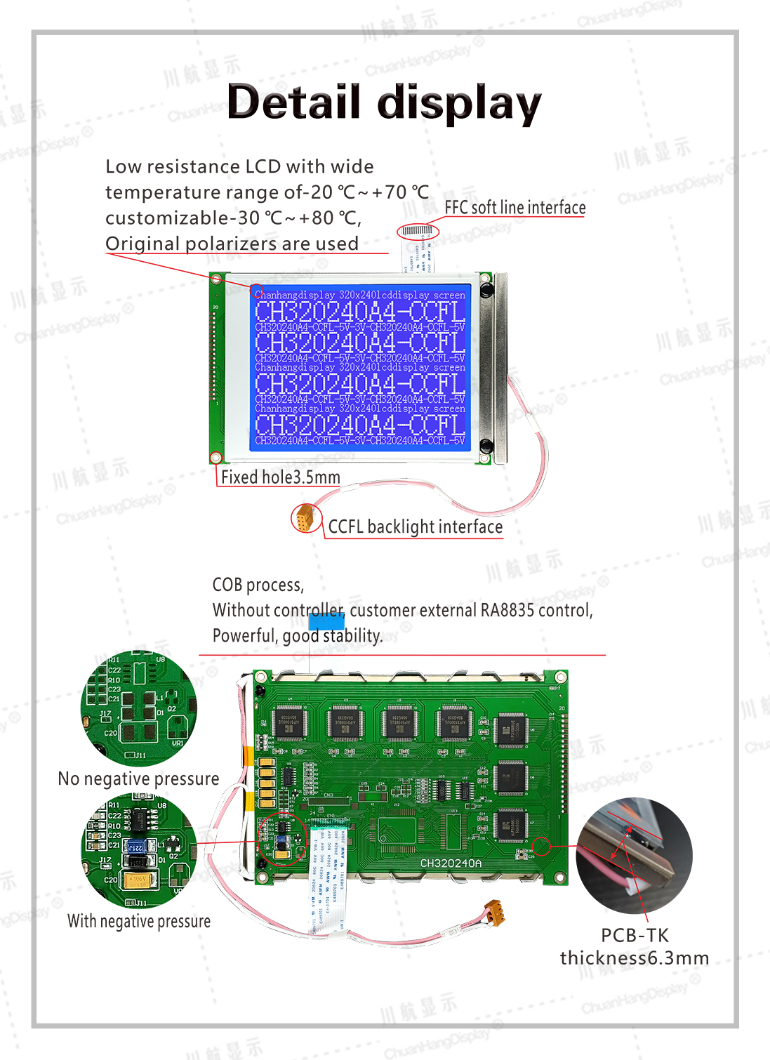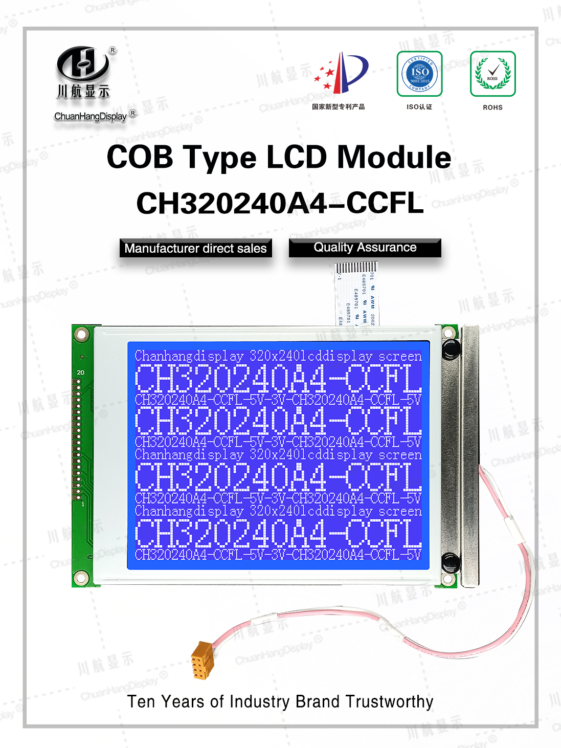 1.1 320*240 resolution, COB process dot matrix LCD module, the product comes with PCB board, CCFL backlight, conductive tape connection, stable structure.