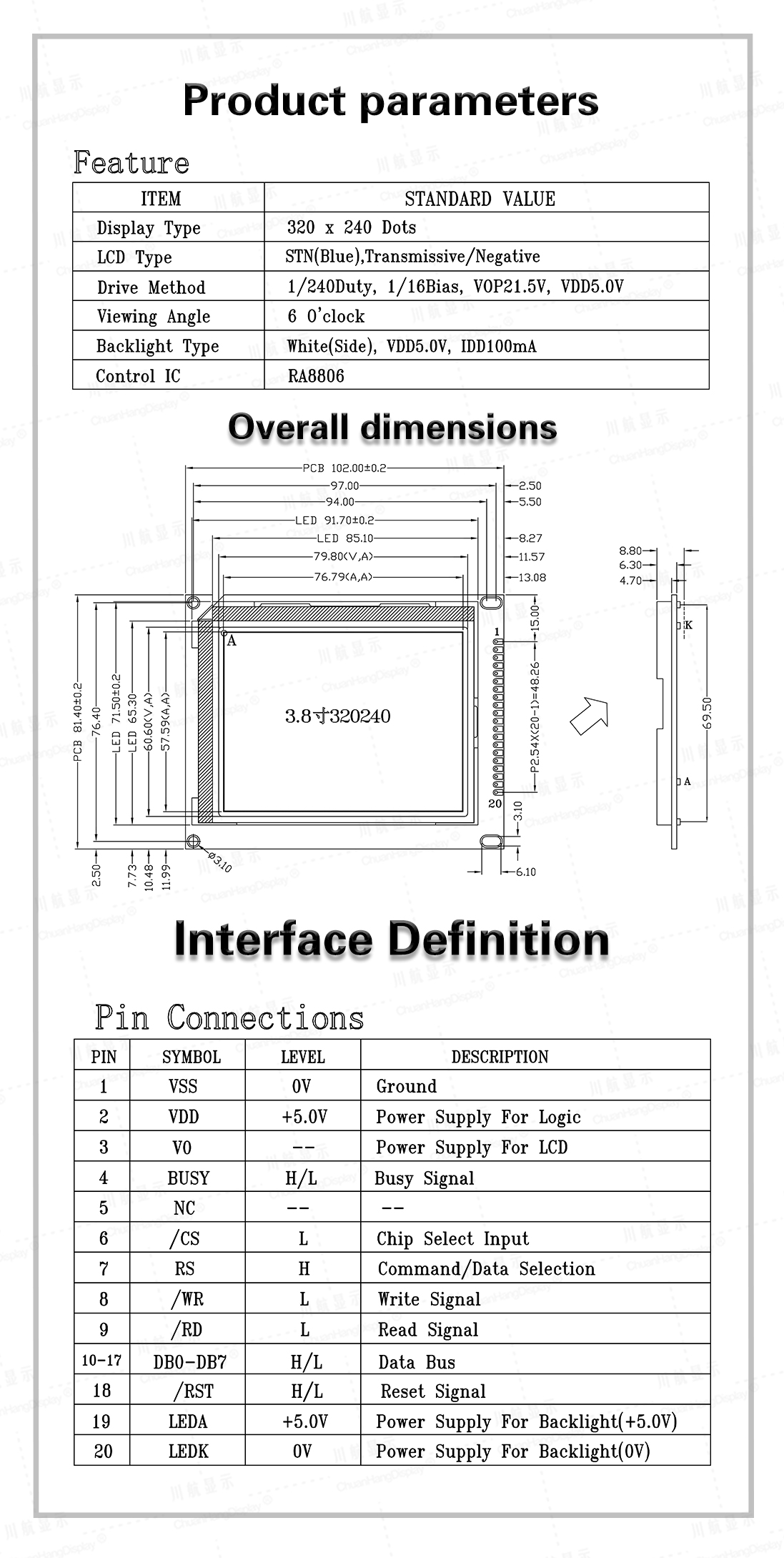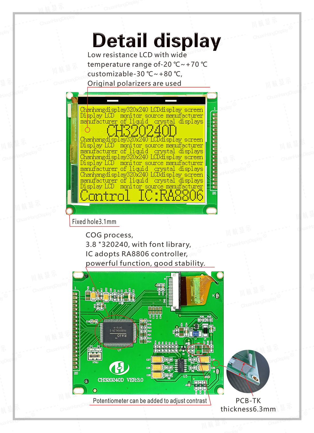 1.1 320*240 resolution, C0G process dot matrix LCD module, product with PCB board, LED backlight, FPC connection, stable structure.