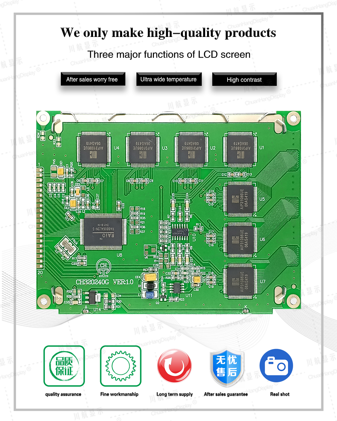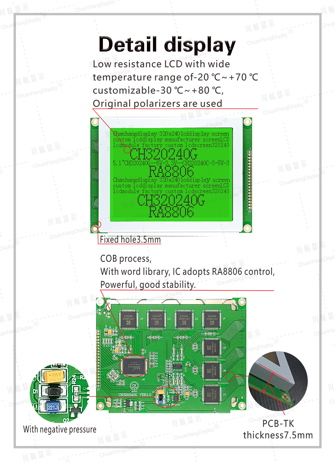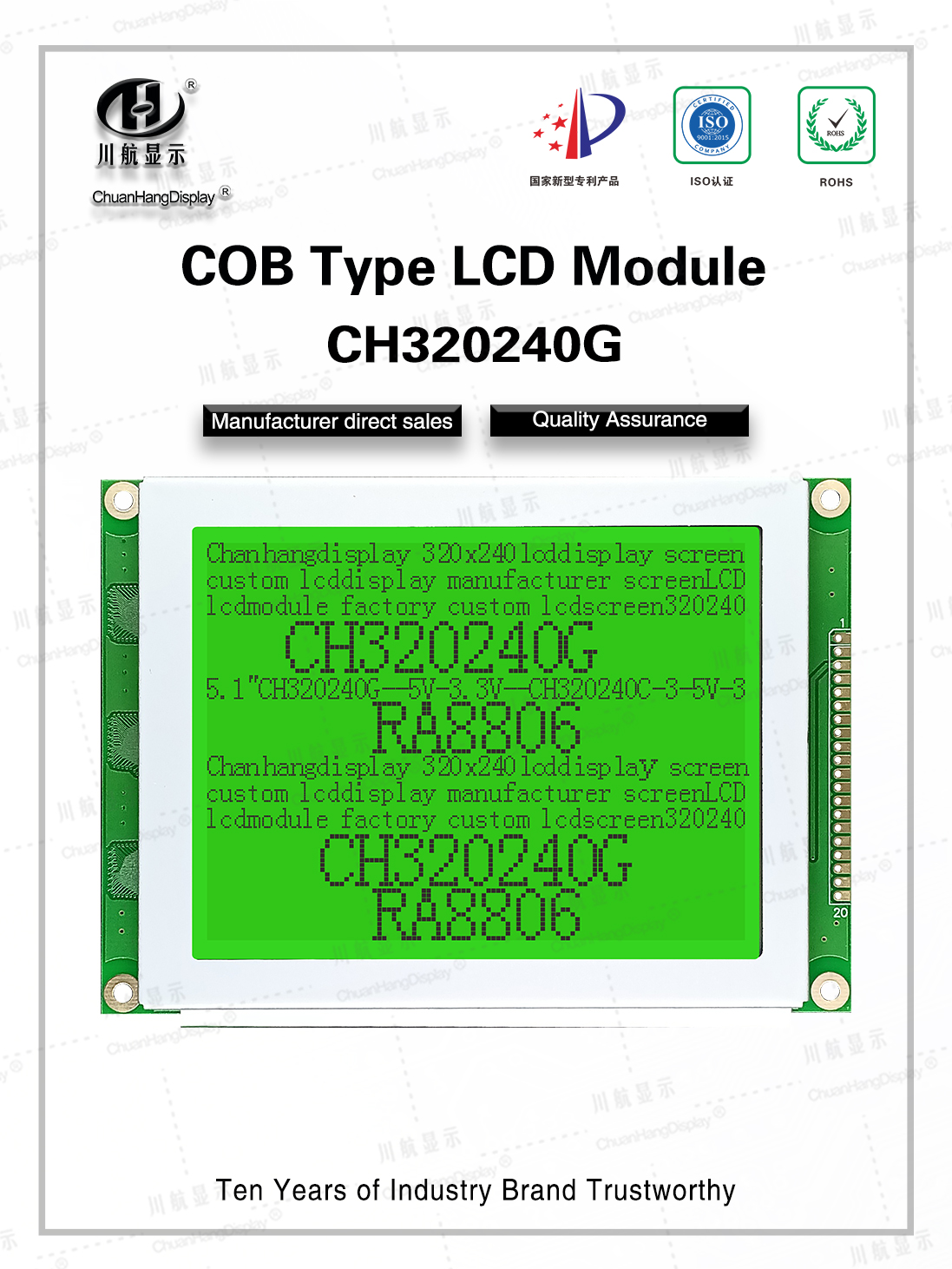1.1 320*240 resolution, C0B process dot matrix LCD module, product with PCB board, LED backlight, conductive tape connection, stable structure.