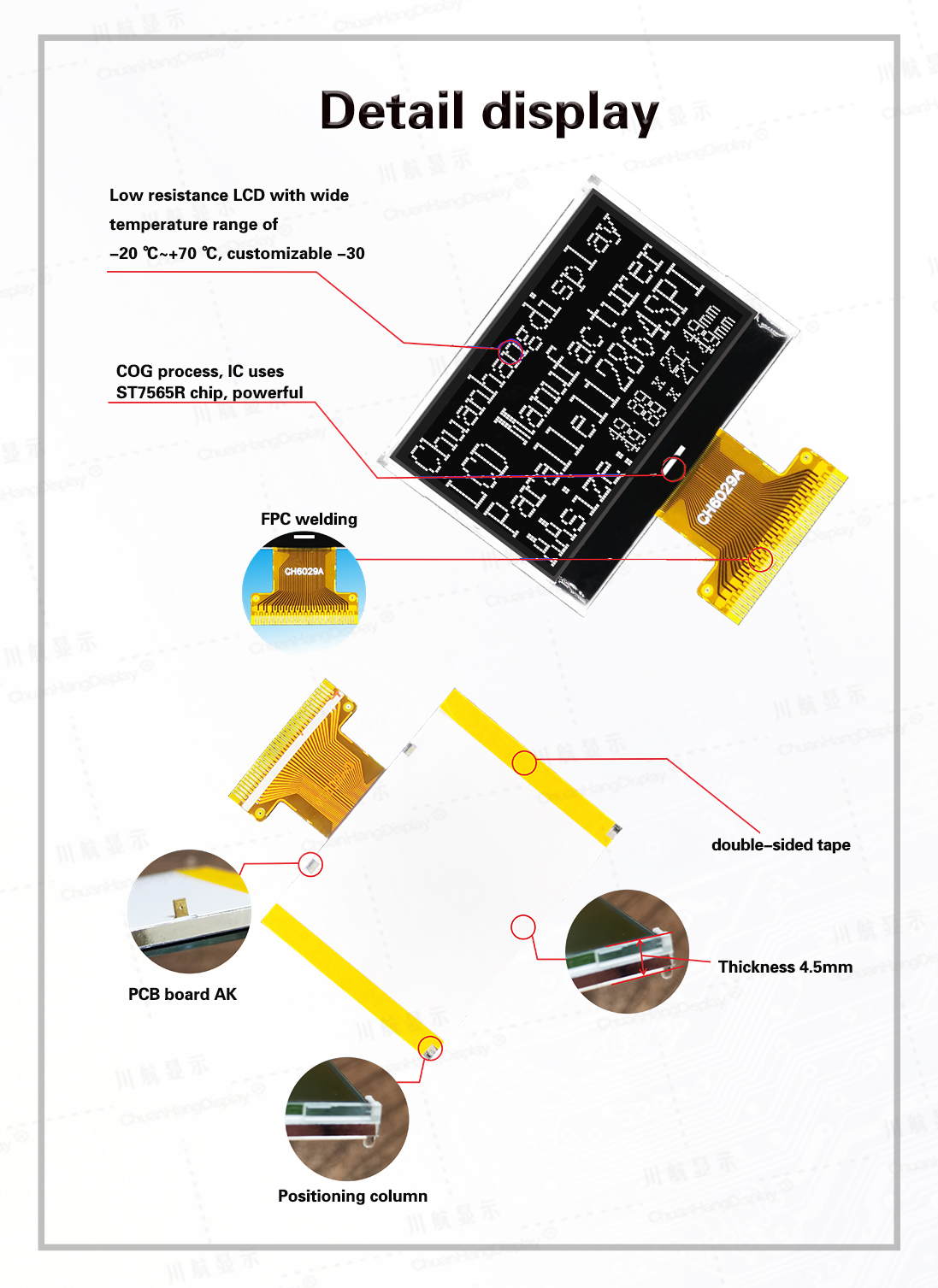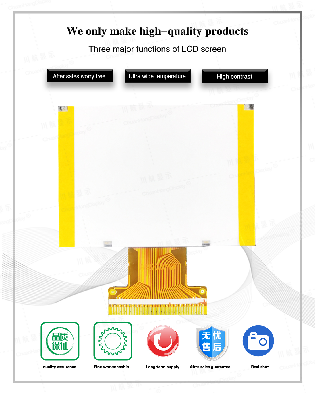1.1 COG process, FPC soft wire is a welding port, the product has backlight, thin thickness and stable structure.