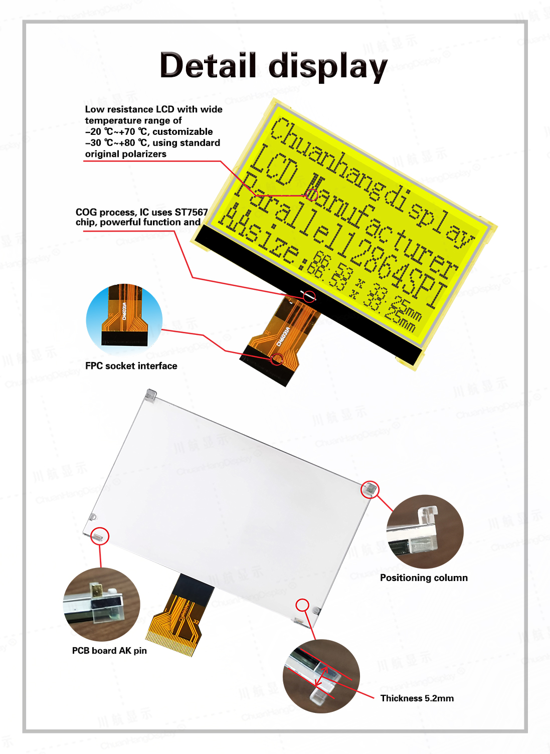 1.1 COG process, FPC soft wiring is a plug-in interface, the product has a backlight, thin thickness and stable structure.
