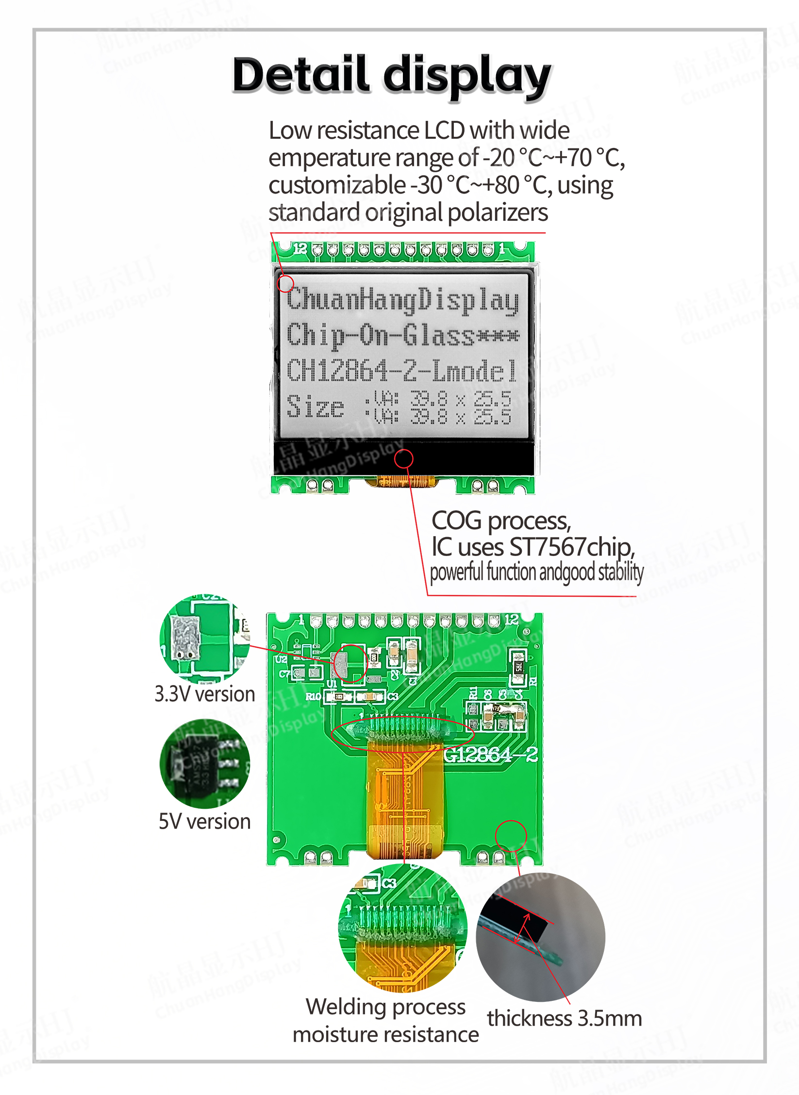 1.1CO0G process, FPC soft wiring is a welding port, the product is with PCB board, backlight, thin thickness, stable structure.