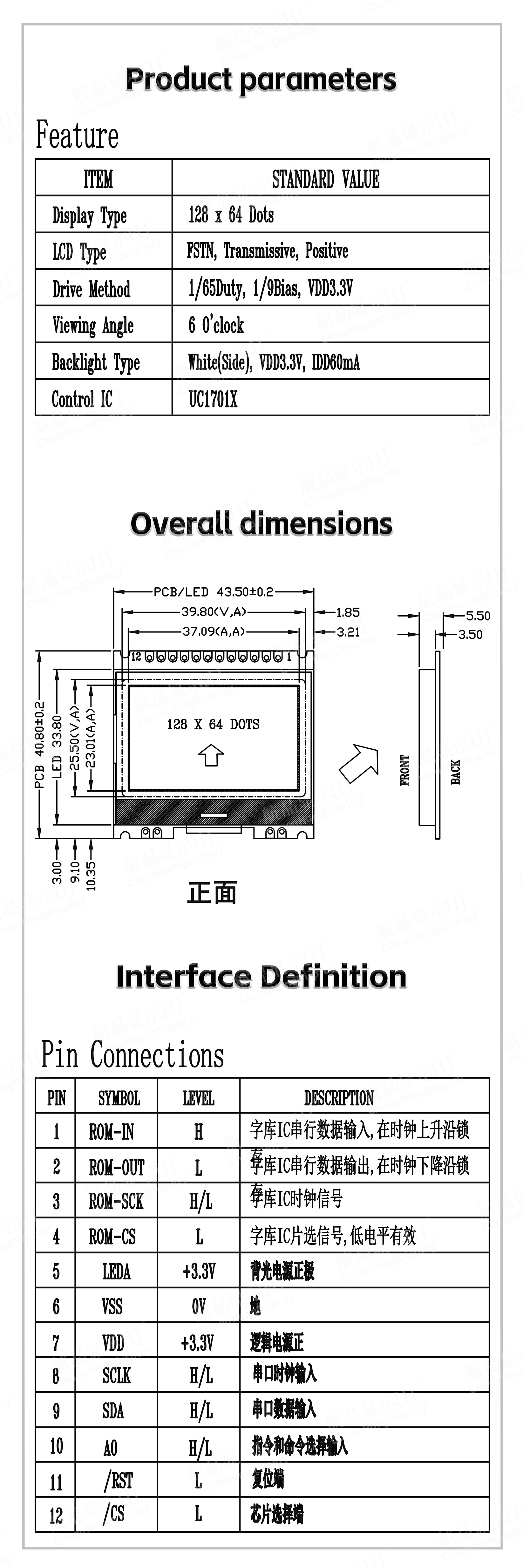 1.3 Low power consumption, 3.3V power supply mode, no backlight current within 1mA, with backlight current within 60mA.