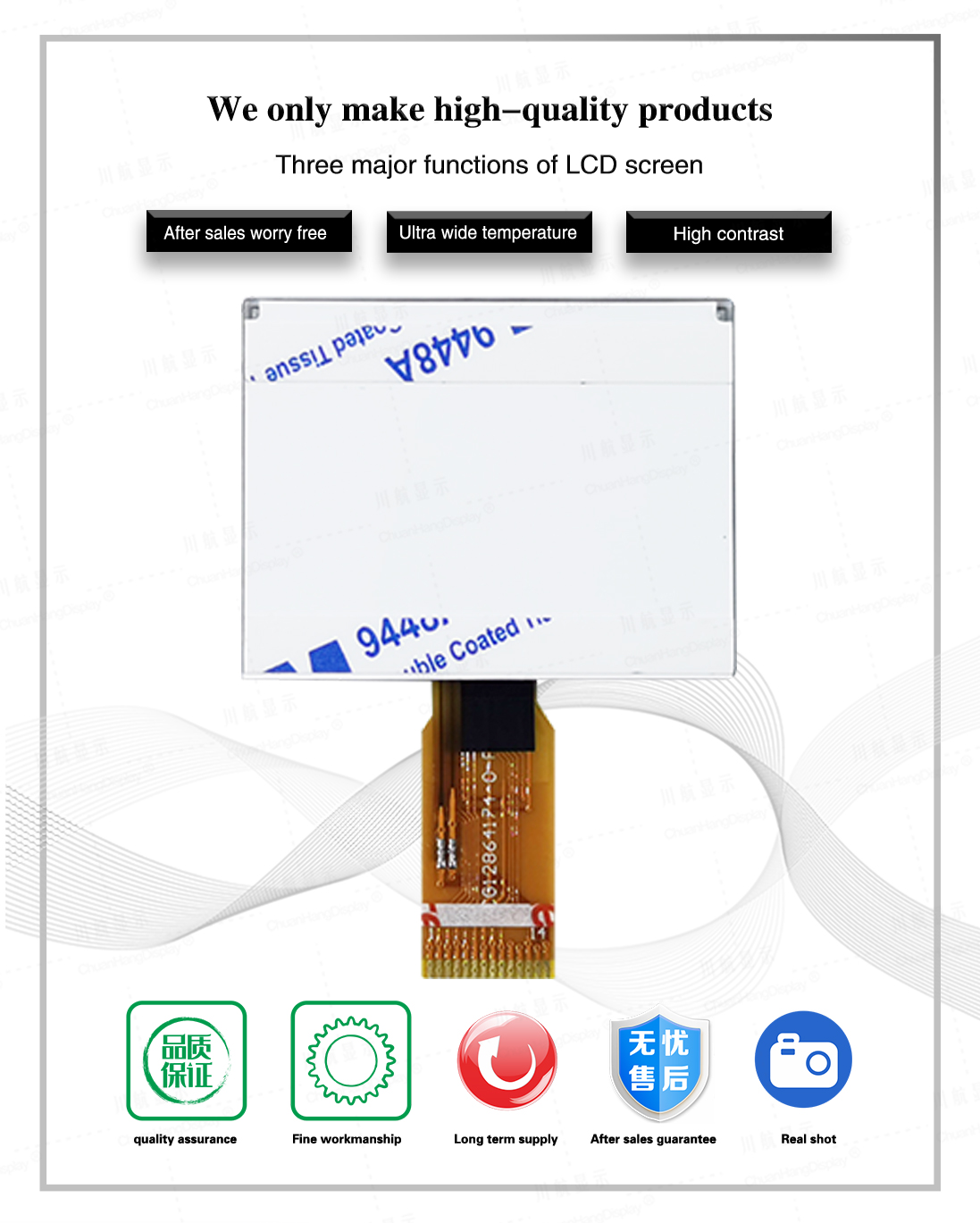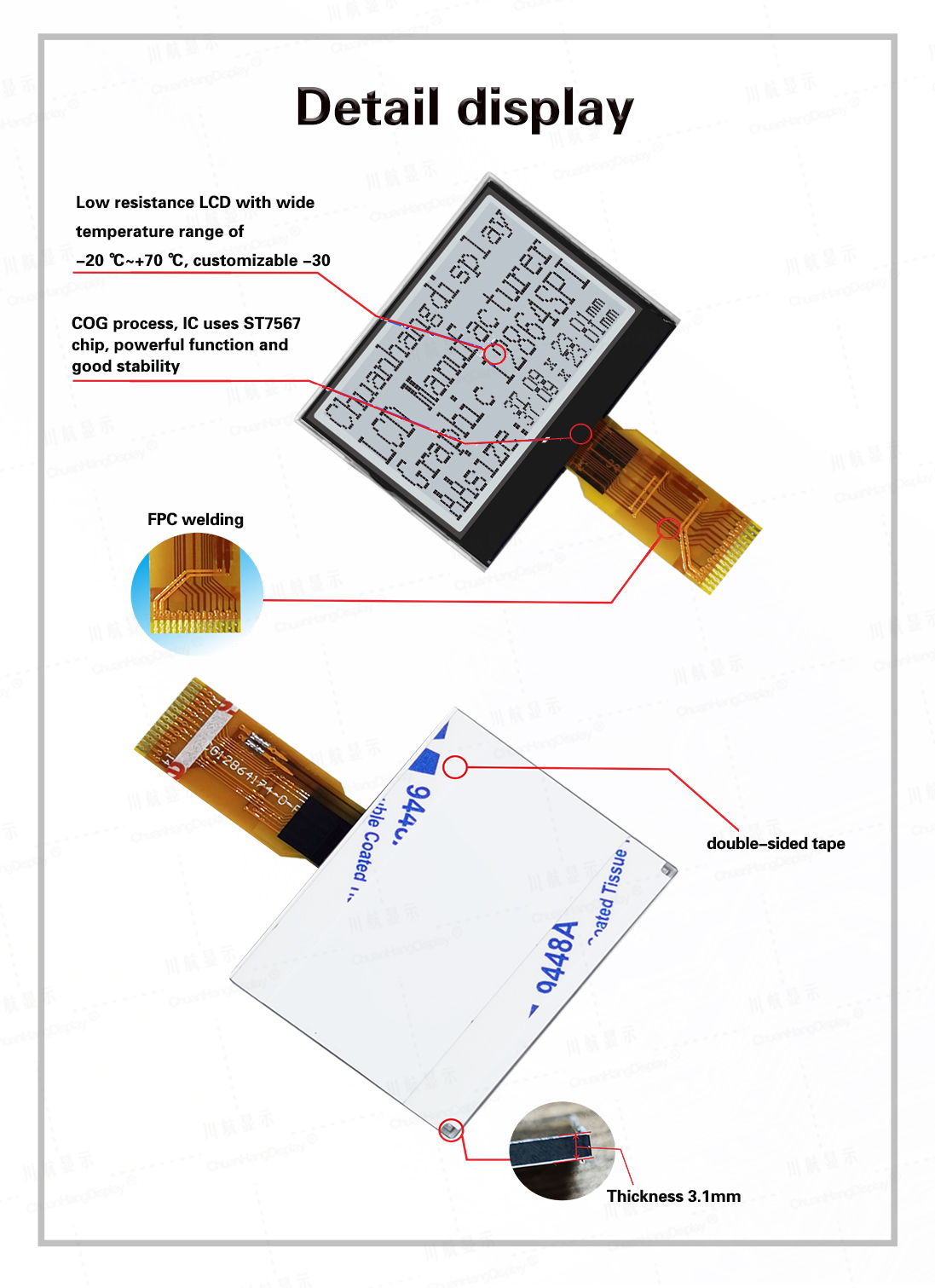1.1 COG technology, FPC soft line is welded, the product has backlight, has been assembled, thin thickness, stable structure.
