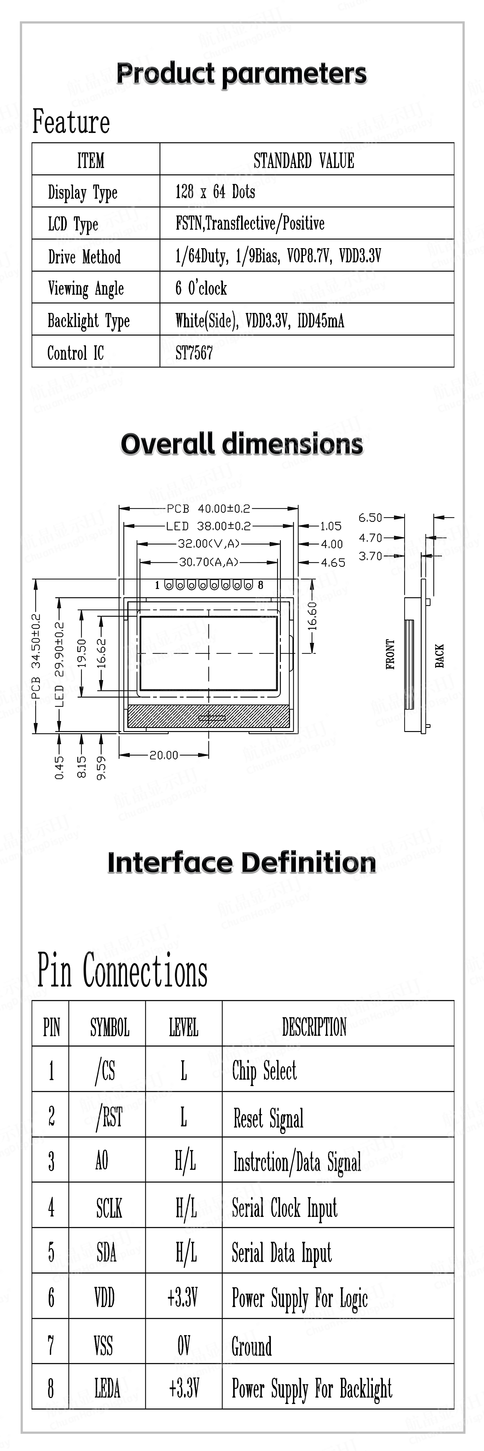 1.3 Low power consumption, default 3.3V power mode, no backlight current within 1mA, backlight current within 60mA Inside.