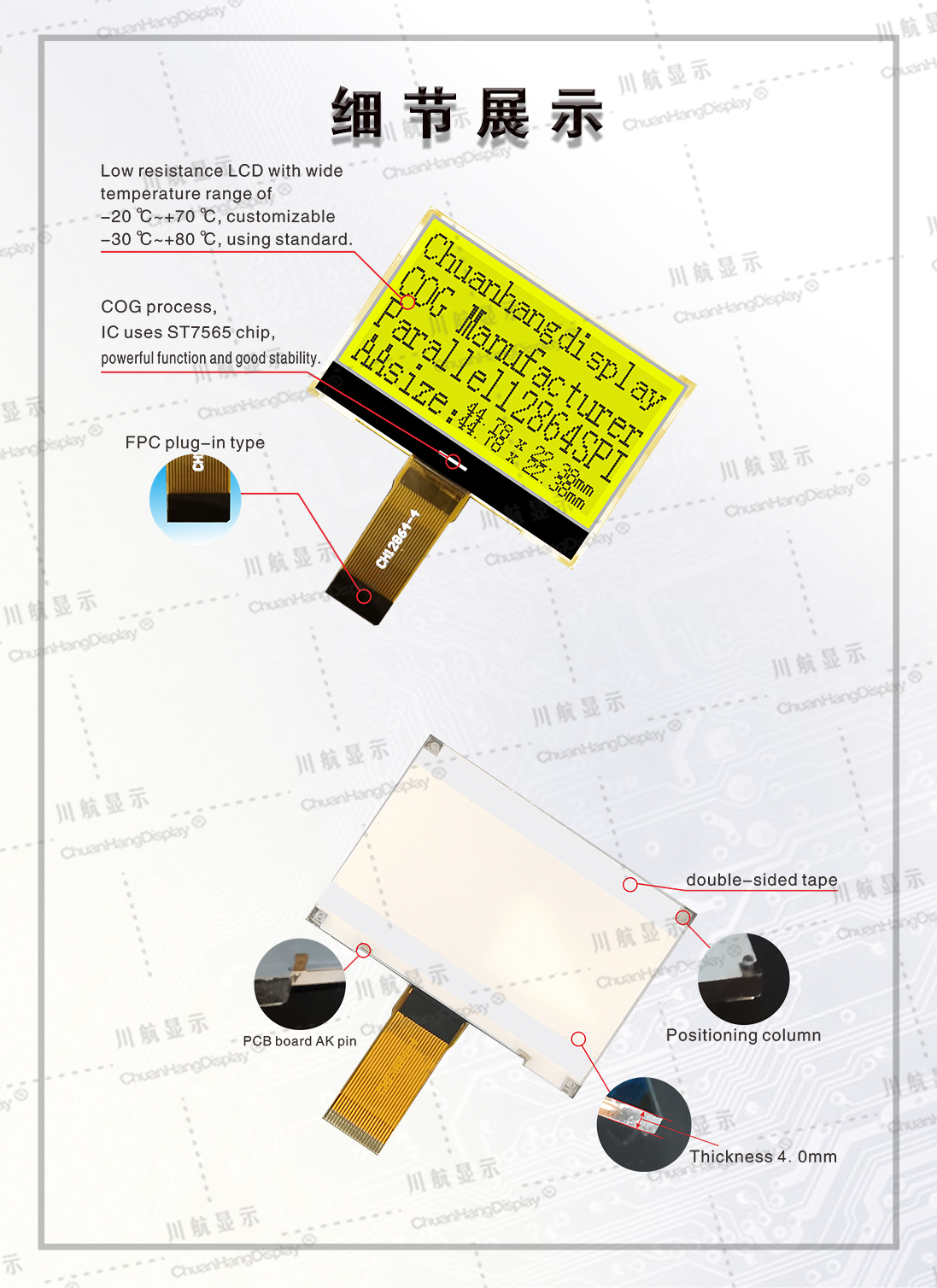 1.1 COG process, FPC soft wiring is a plug-in interface, the product has backlight, has been assembled, thin thickness and stable structure.