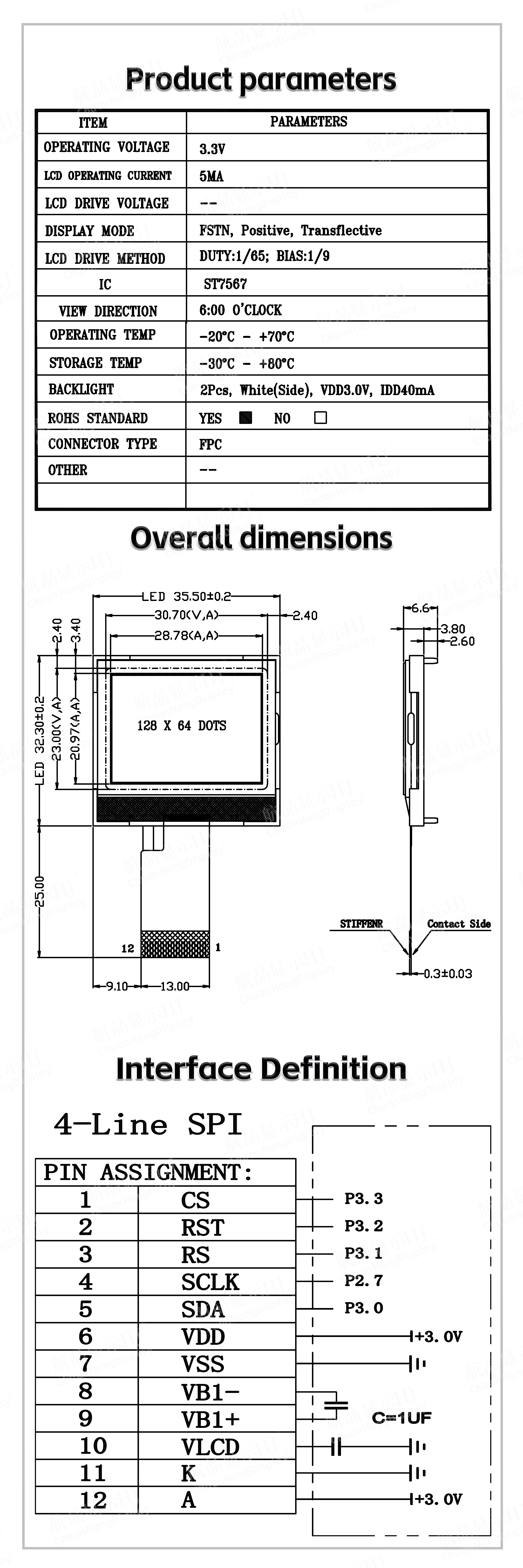 ●Single picture ≤128x64 dot matrix. 4-wire SPI interface communication.