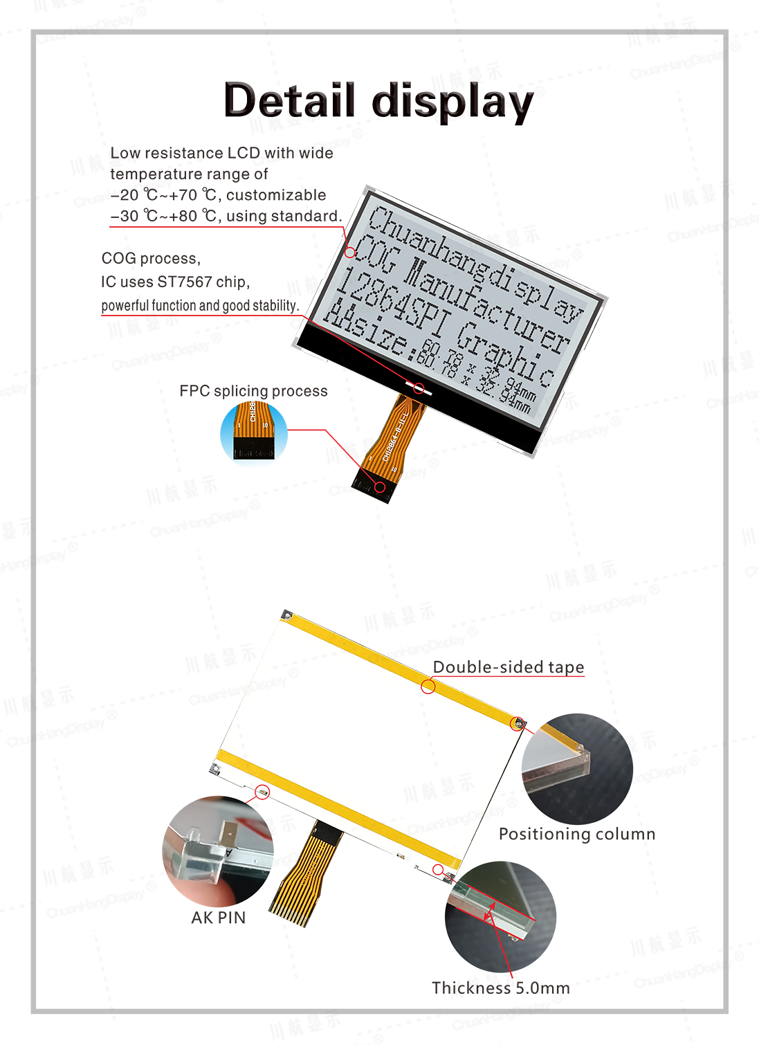 1.1 COG process, FPC soft wiring is a plug-in interface, the product has backlight, has been assembled, thin thickness and stable structure.