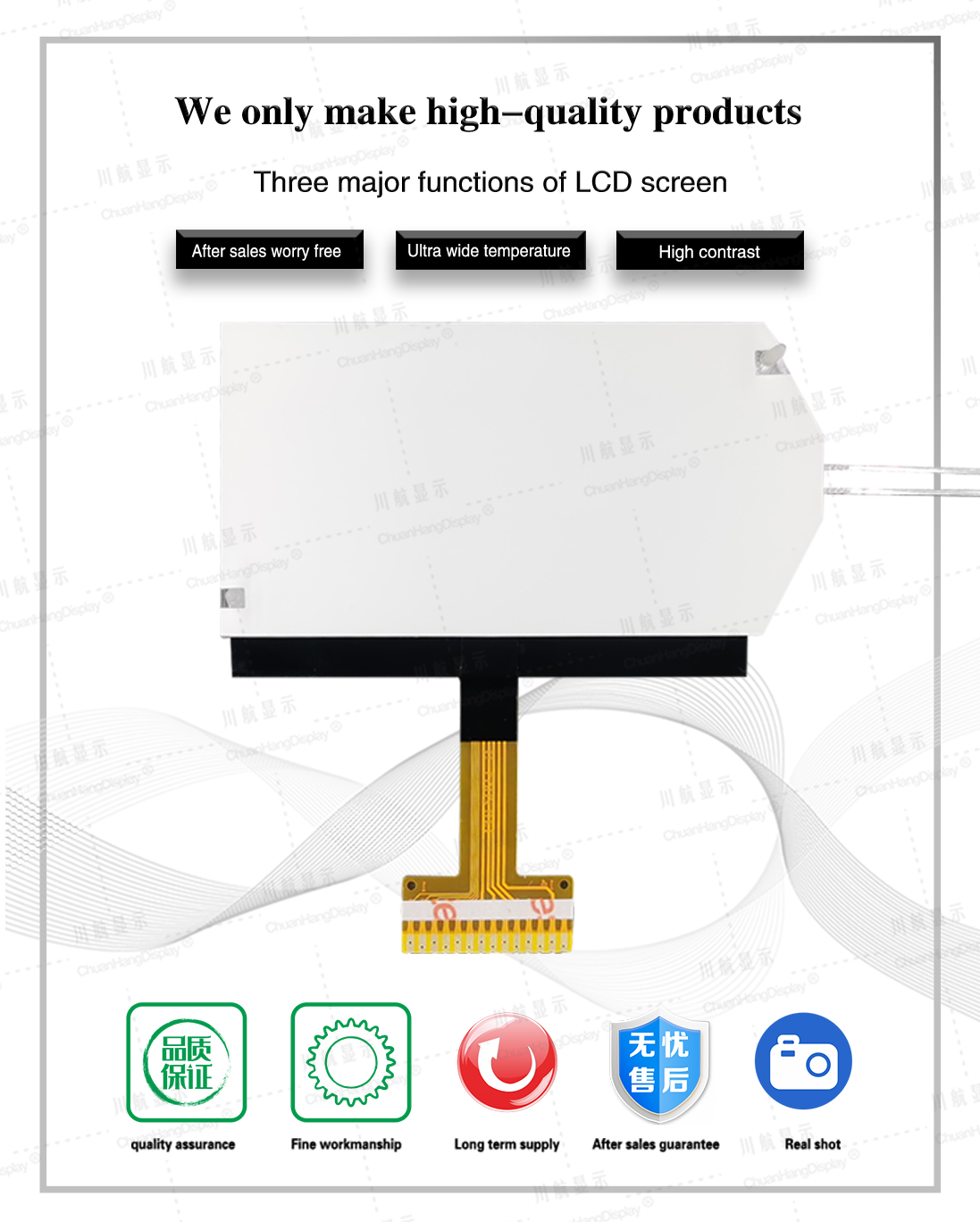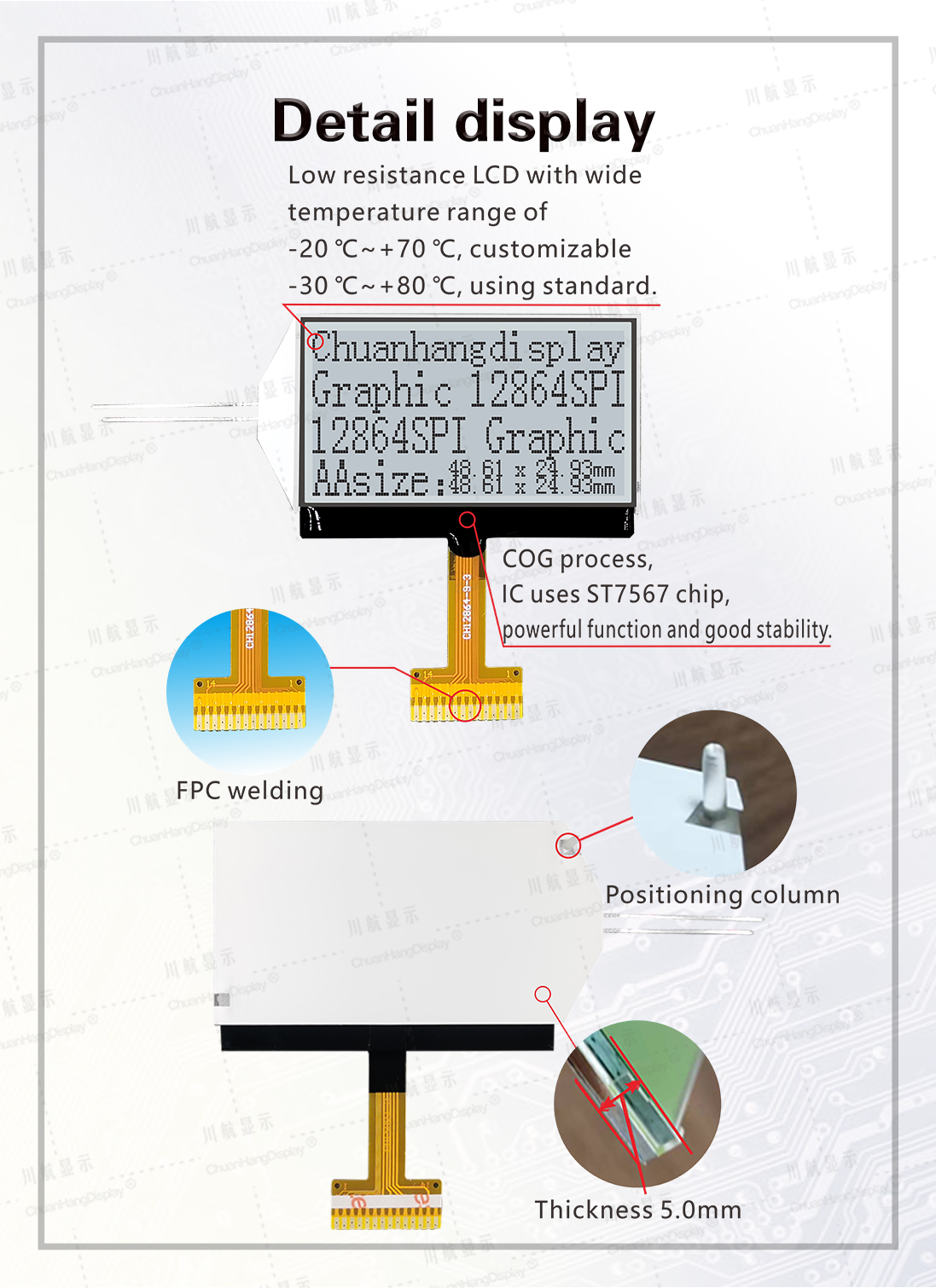 1.1 COG technology, FPC soft line is welded, the product has backlight, has been assembled, thin thickness, stable structure.