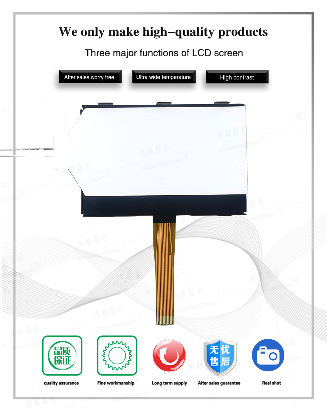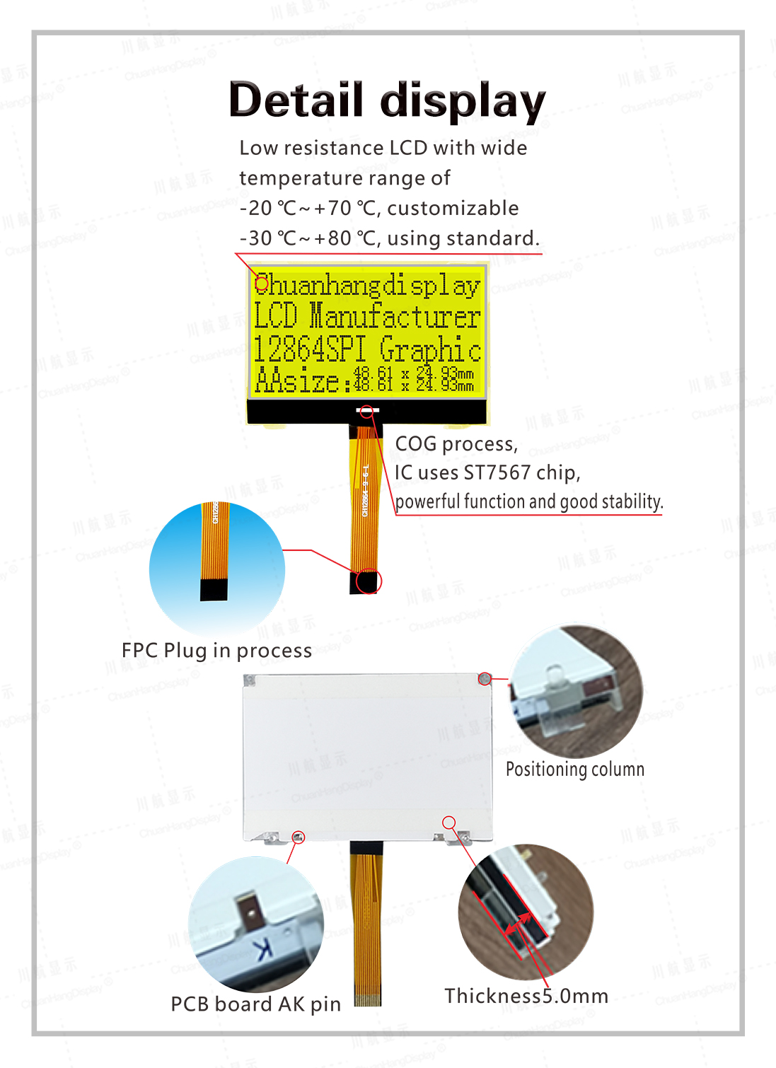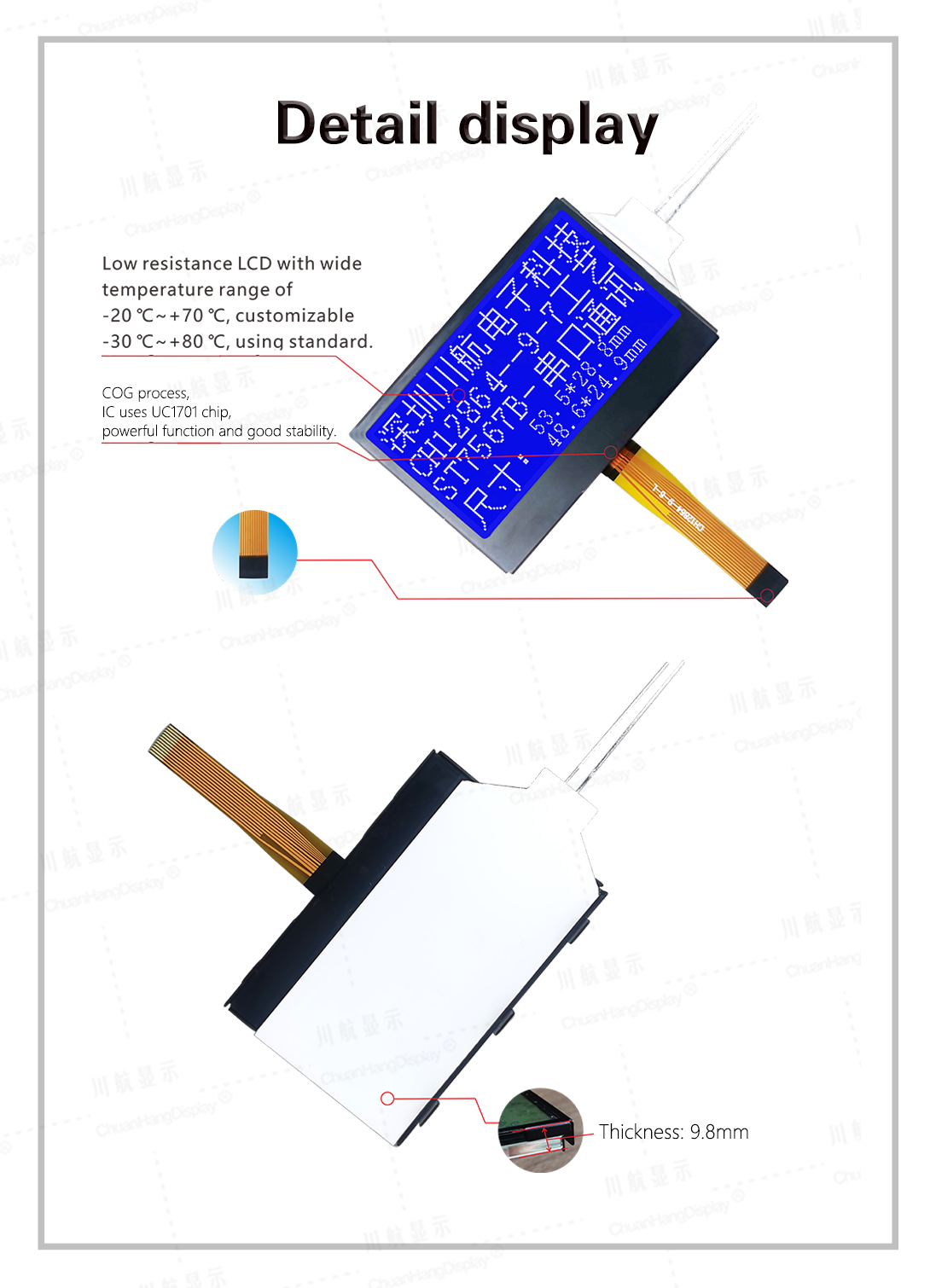 1.1 COG process, FPC soft wiring is a plug-in interface, the product has backlight, has been assembled, thin thickness and stable structure.