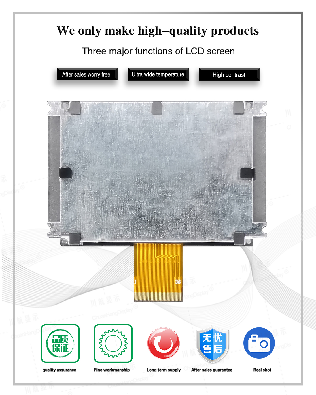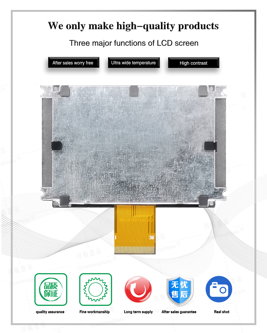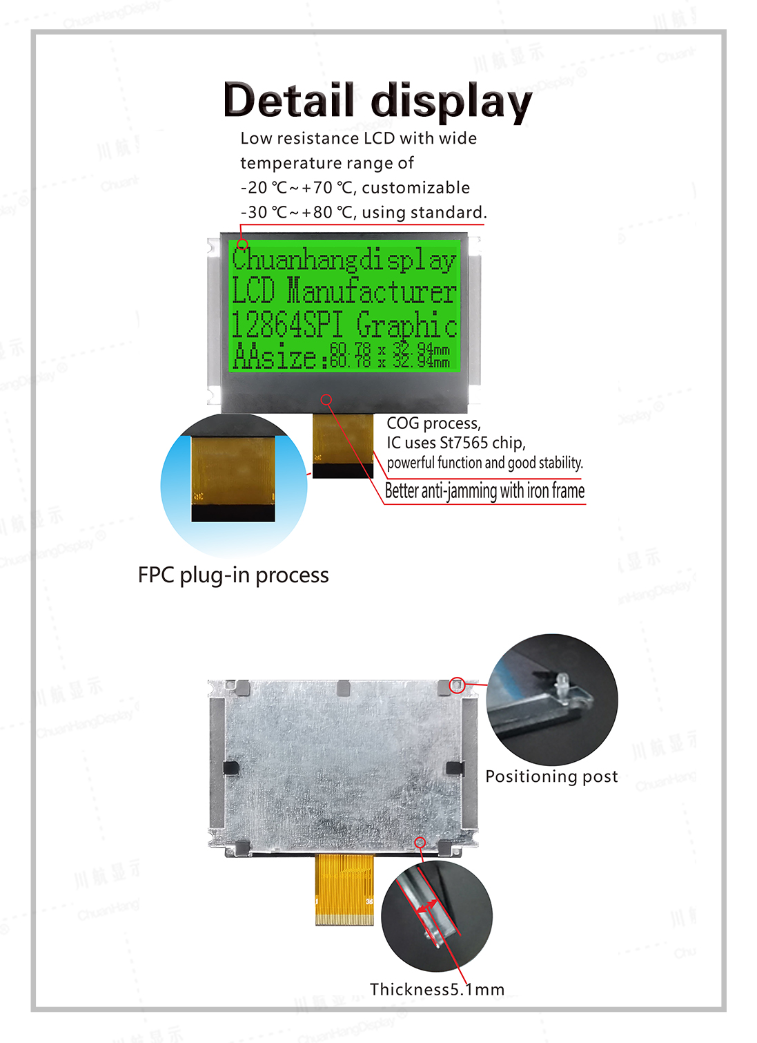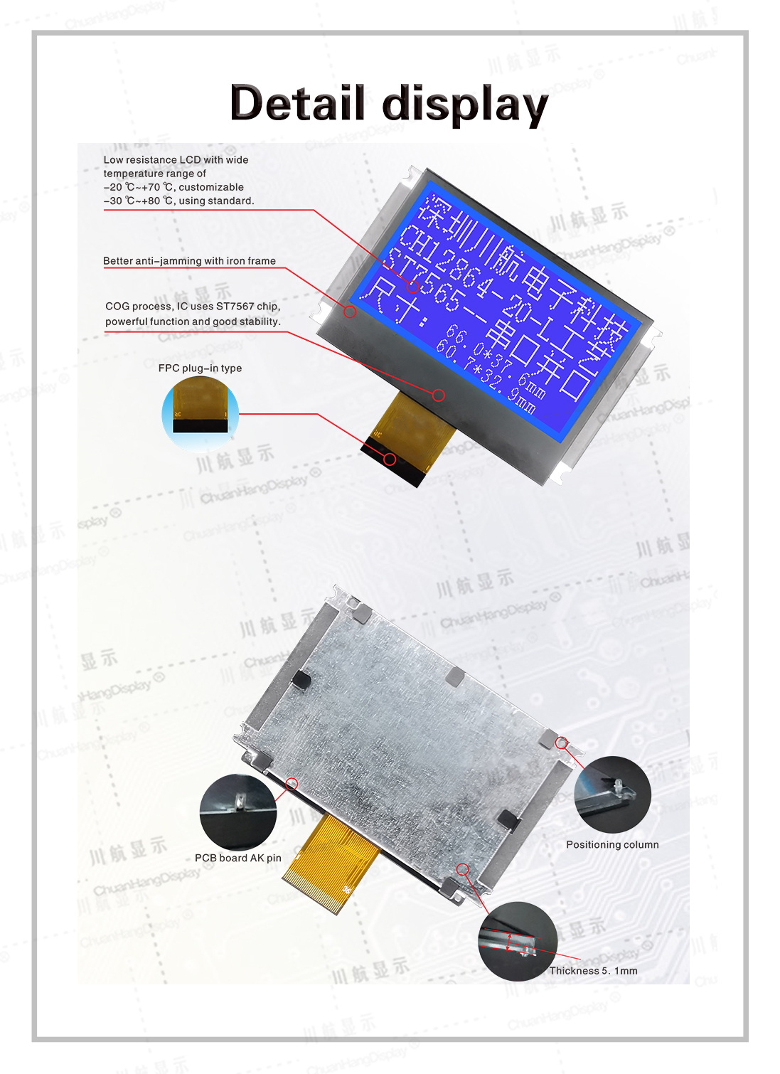 1.1 COG process, FPC plug-in process, product with pcb board, backlight, thin thickness, stable structure.