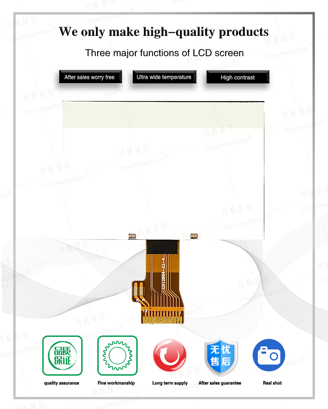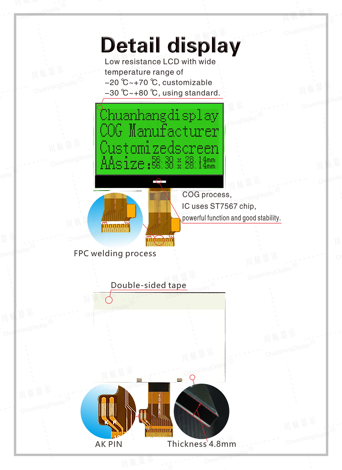 1.1 COG technology, FPC soft line is welded, the product has backlight, has been assembled, thin thickness, stable structure.