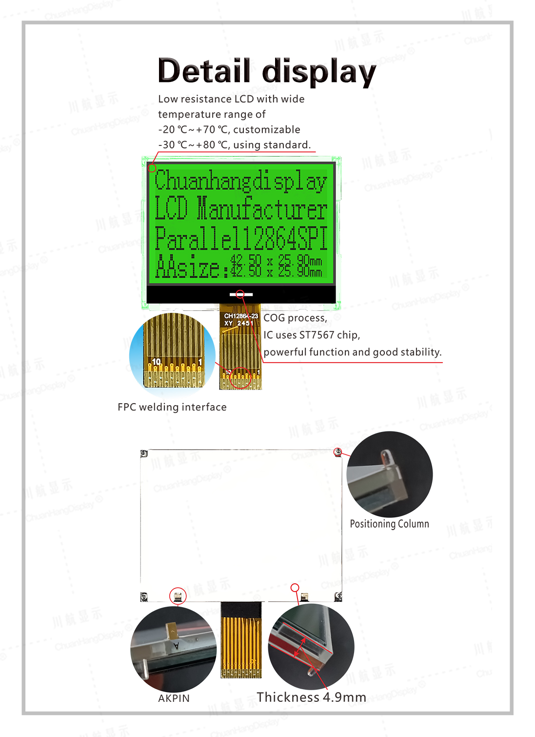 1.1 COG process, FPC soft wiring is a welding port, the product has backlight, has been assembled, thin thickness and stable structure.