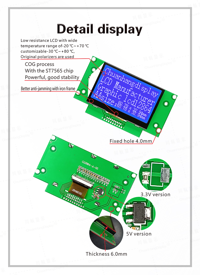 1.3 Low power consumption, default 3.3V power mode, no backlight current within 1mA, backlight current within 100mA Inside.