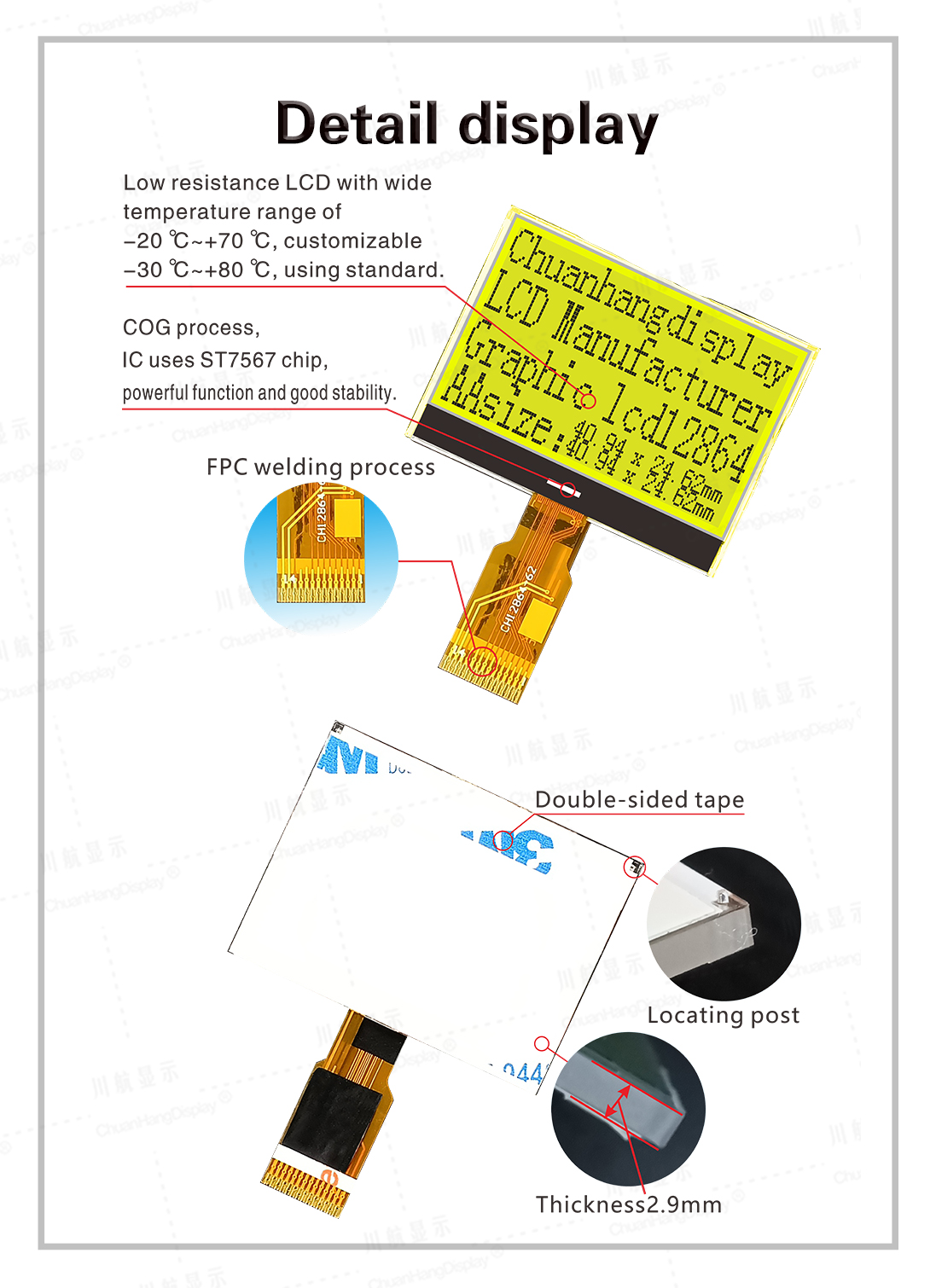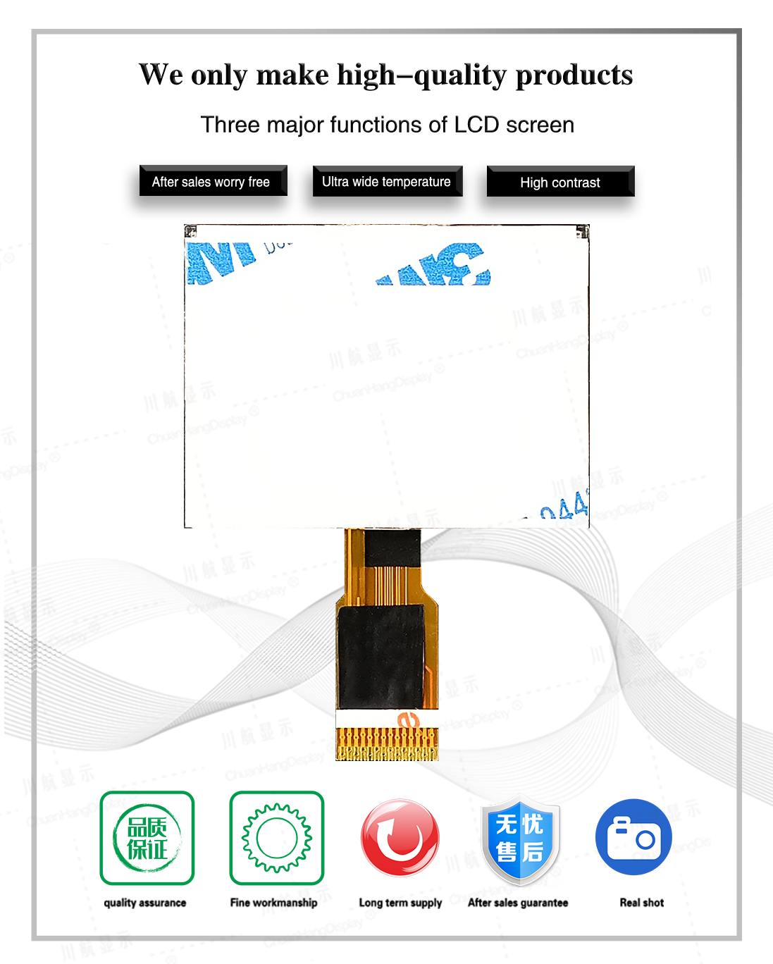 1.1 COG process, FPC soft wire is a welding port, the product is backlit, assembled, thin in thickness and stable structure.