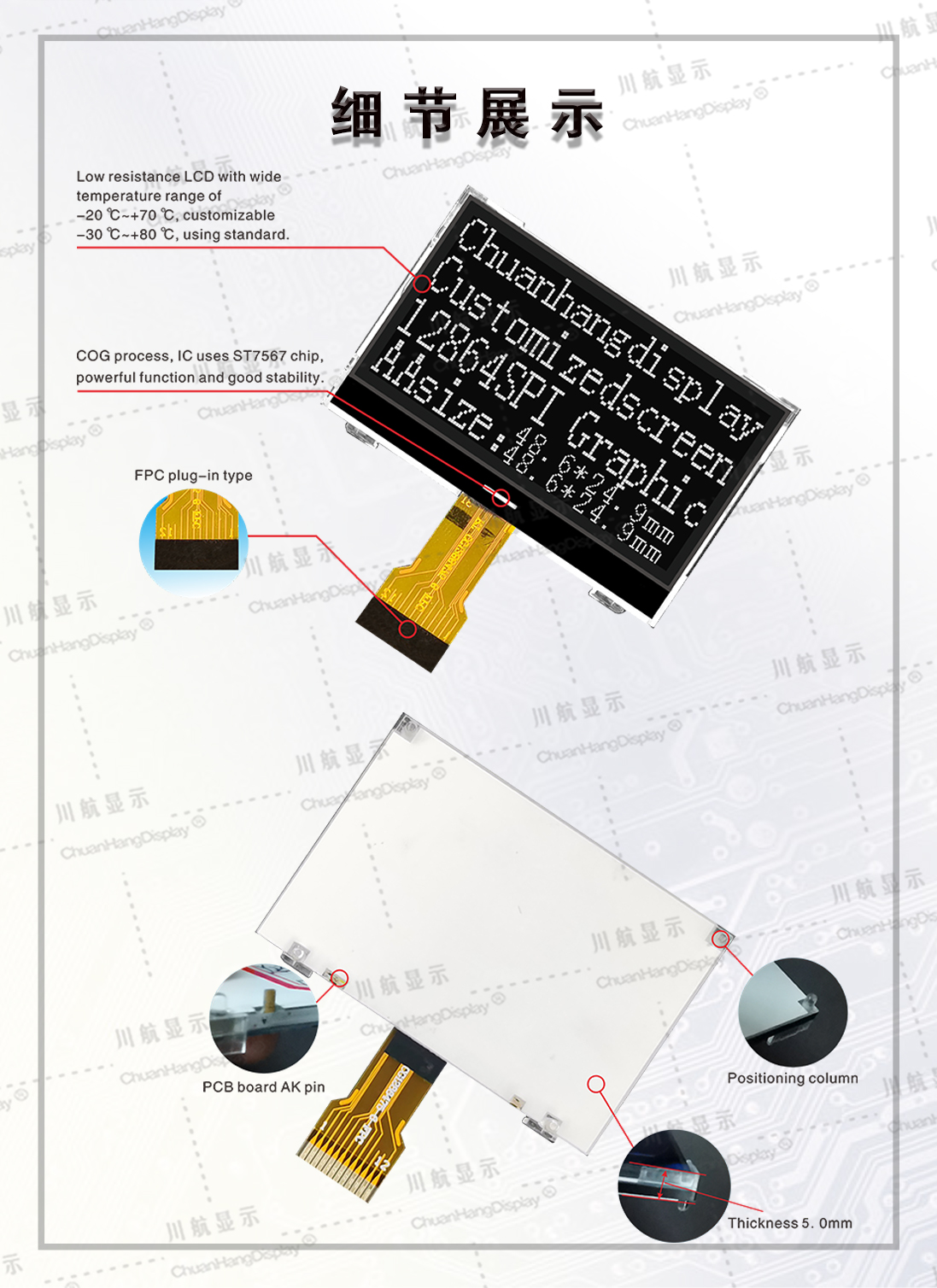 1.1 COG process, FPC soft wiring is a plug-in interface, the product has backlight, has been assembled, thin thickness and stable structure.