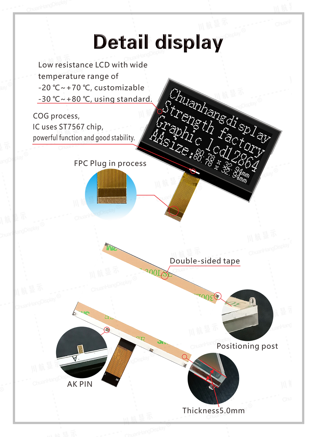 1.1 COG process, FPC soft wiring is a plug-in interface, the product has a backlight, thin thickness and stable structure.