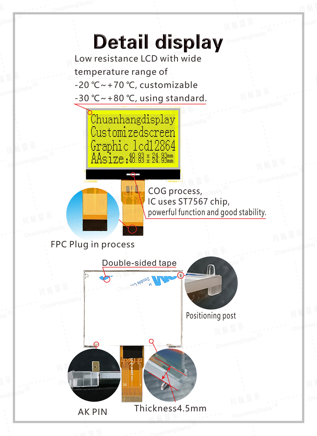 1.1 COG process, FPC soft wire is plug-in interface, product with backlight, assembled, thin thickness and stable structure.