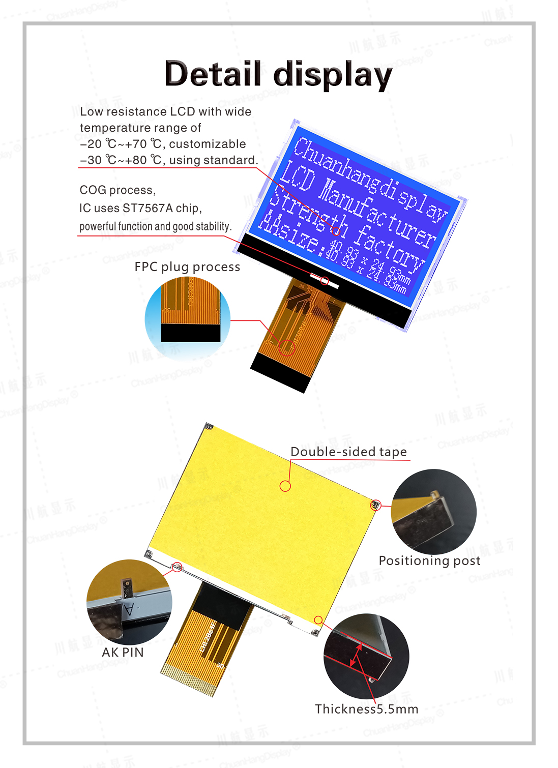 1.1 COG process, FPC soft cable is a plug-in interface, the product has backlight, assembled, thin thickness and stable structure.