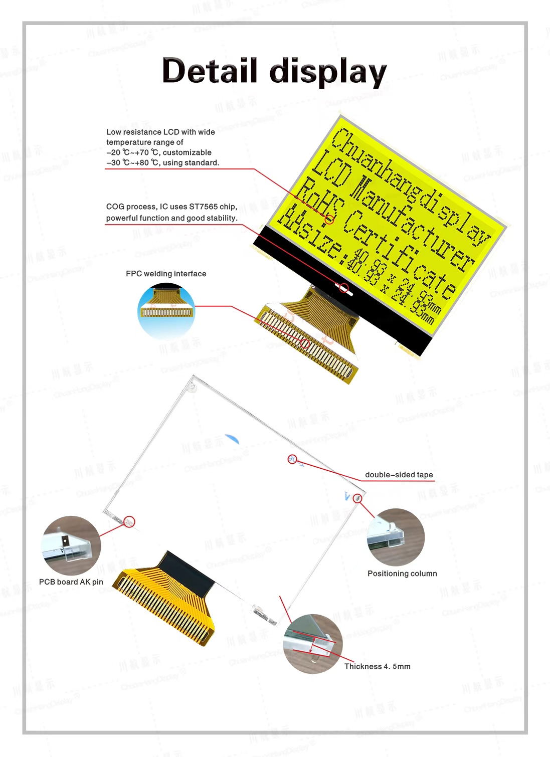 1.1 COG process, FPC soft wiring is a welding port, the product has backlight, has been assembled, thin thickness and stable structure.