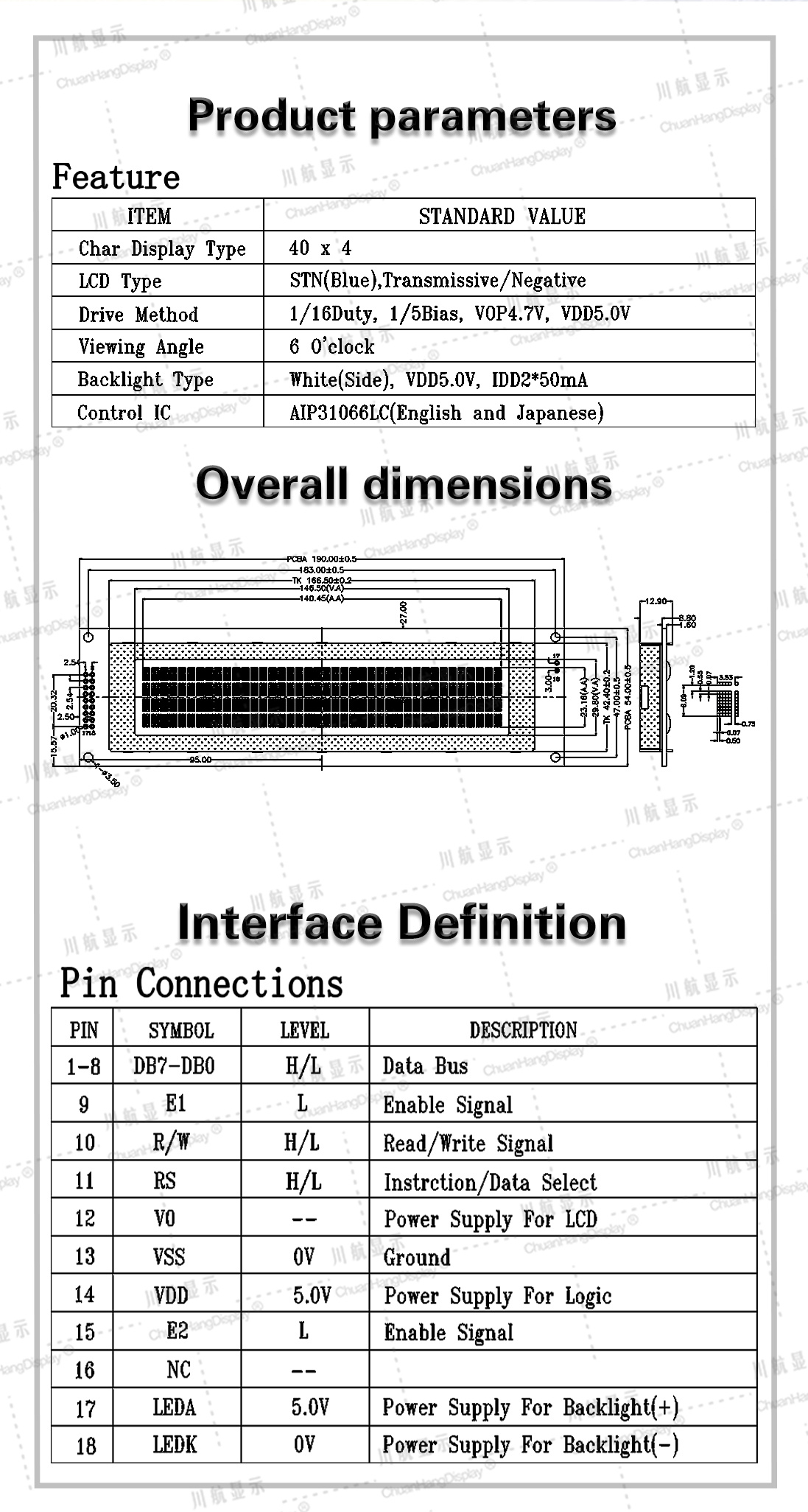 1.2 Font includes English-Japanese, English-European, English-Russian, default is English-Japanese, IC using AIP31066L. When using RW1063, optional SPI and I2C interface.