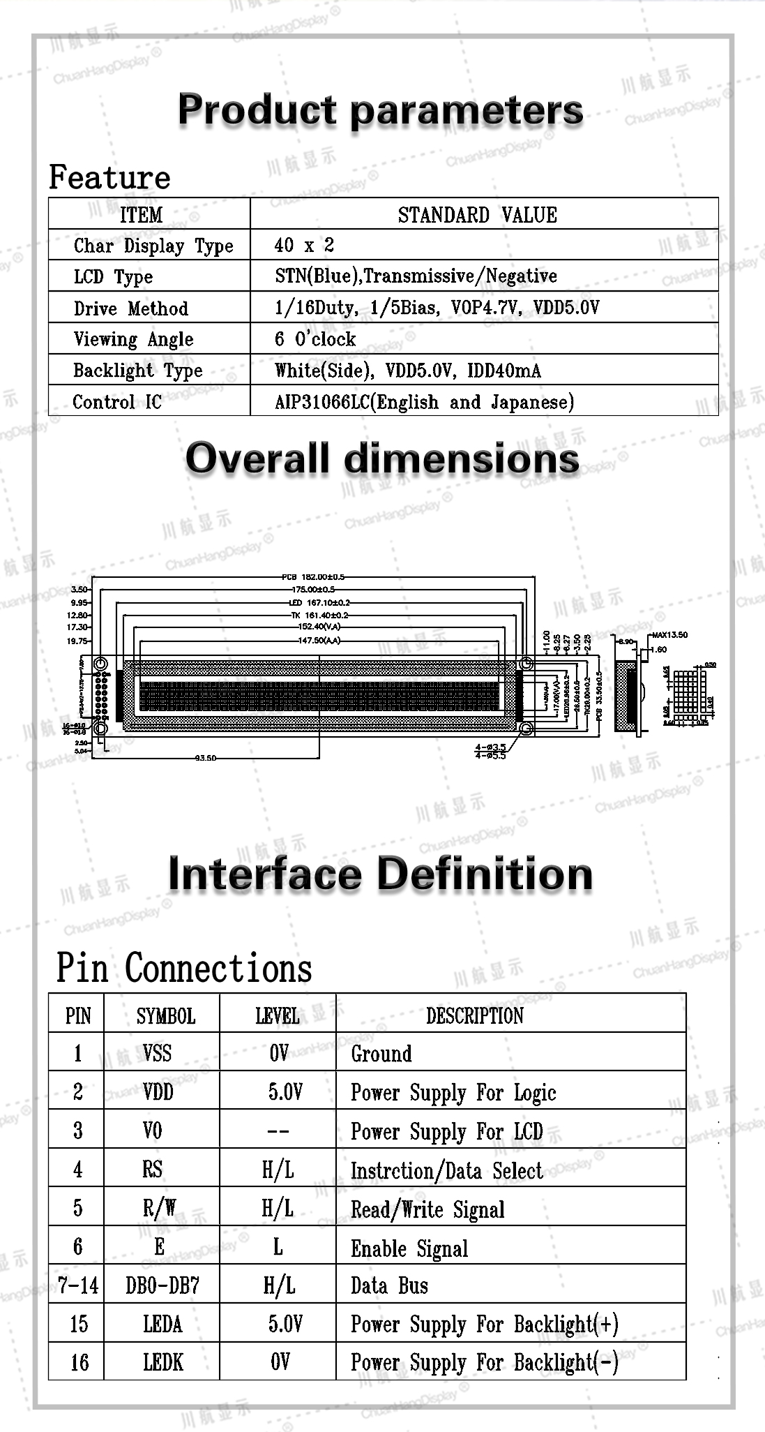 1.2 Font includes English-Japanese, English-European, English-Russian, default is English-Japanese, IC using AIP31066L. When using RW1063, optional SPI and I2C interface.