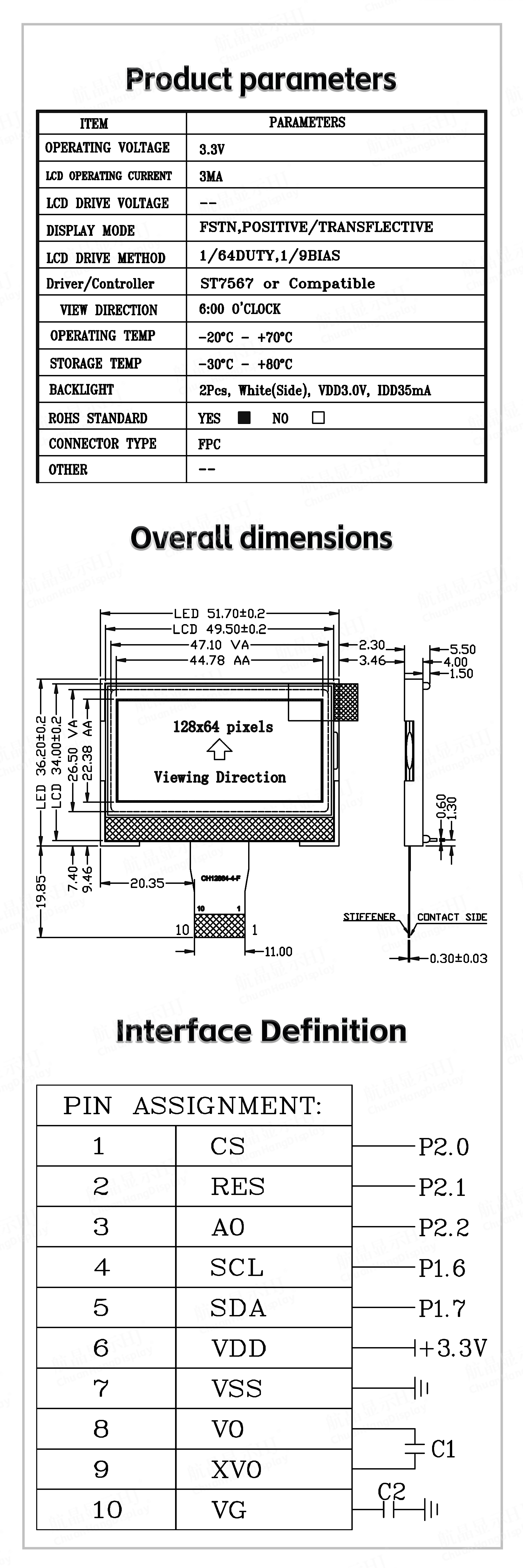 ●Single picture ≤128x64 dot matrix. 4-wire SPI interface communication.