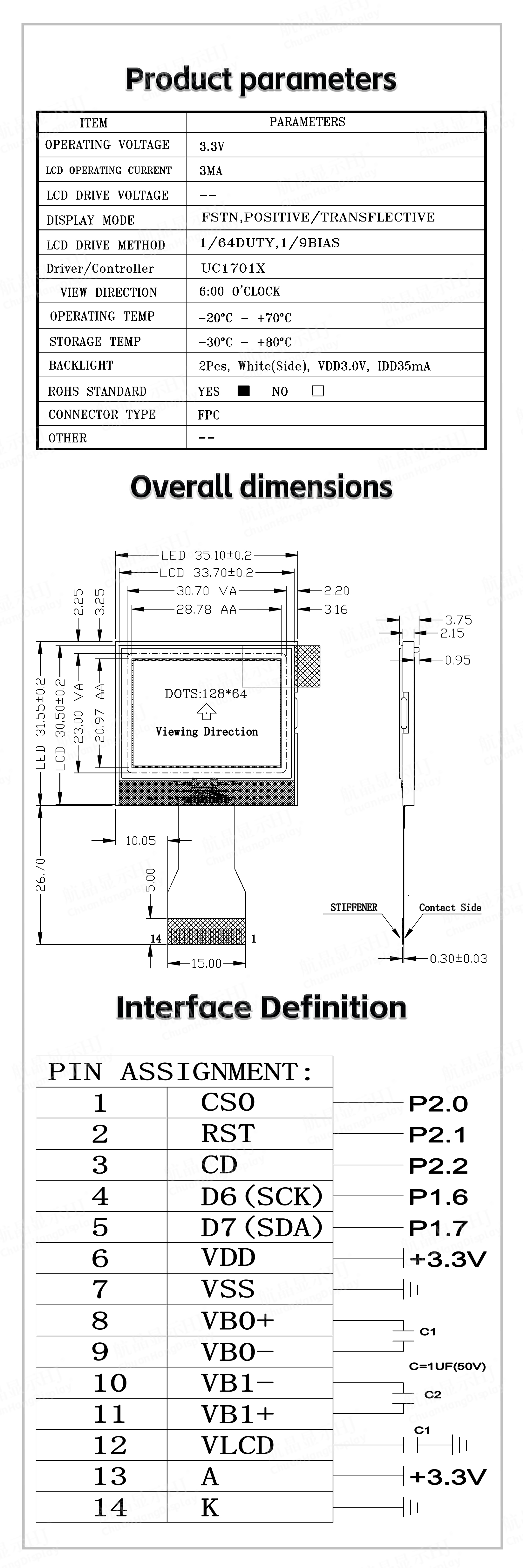 | Active Area(L*W) | 28.78x20.97mm | Dot Size (mm) | 0.21(L)x0.31(W) |